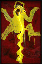 Zu Beginn der 90-er Jahre setzt ein Wandel innerhalb seiner Technik und der verwandten Materialien ein. Mittels herabtropfender Farben und beigemengter Materialpartikel verwischte er die Konturen und tauchte seine Figuren scheinbar in eine 'kultische Bedeutung' ein. Für das Album 'Fétiches' fertigte er 1995 vier Lithografien (Bernardo Pinto de Almeodo, Text). Eine Mexiko-Reise 1993 und die Beschäftigung mit der mexikanischen Kunst und Kultur inspirierten ihn zu einer umfangreichen Serie, die sich teils an der Volkskunst orientierte und einen unpathetischen Umgang mit dem Tod pflegte. 1998 schließt sich nach langjähriger Beschäftigung des Künstlers mit der asiatischen Kultur die China-Serie an. Der Bildtitel 'Traum in der Pagode des Himmlischen Palastes', einem chinesischen Gedicht entnommen, weist auf seine besondere Beschäftigung mit der Literatur hin.