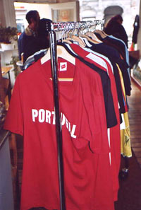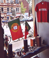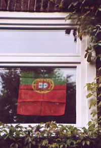 Klar dass sich das Fahnenfieber bis in die portugiesischen Gemeinden im Ausland verbreitete. Und Hamburg bildete da keine Ausnahme: viele Fahnen in den von Portugiesen bewohnten Vierteln, in den portugiesischen Restaurants, Lebensmittelläden und Cafés, von denen es in der Hansestadt ja reichlich gibt. Auch unsere Gesellschaft wollte nicht zurückstehen und so haben wir im Fenster unseres Büros in der Susettestraße eine kleinformatige Nationalfahne aufgehängt, eine Gratisbeilage der Zeitung Público.