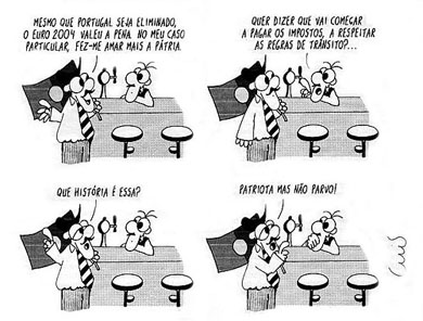 Nicht allen gefiel dieser Ausbruch von Patriotismus. Der Schriftsteller und Journalist Miguel Sousa Tavares spricht von einer "patriotischen Hysterie, wie sie selbst in den goldenen Zeiten des Salazarismus unbekannt war" (Público, 18.6.04). Er weigert sich, wie es angeregt wurde, Figo, Scolari und Genossen als "Helden des modernen Patriotismus" zu nennen. Die wirklichen Helden sind für ihn Portugiesen wie "Saramago, Siza, Damásio, Maria João Pires... und Mário Soares" . Und mit ihm fühlen sich auch andere Intellektuelle wie Clara Ferreira Alves, die Direktorin der Casa de Pessoa und die junge Schriftstellerin Inês Pedrosa unwohl bei der Amerikanisierung, die sich in diesem hohlen Patriotismus zeigt. Von dieser kritischen Haltung zeugt auch die Karikatur von Luís Afonso, ebenfalls in Público (16.6.04), wo ein bekennender "Patriot", mit der Fahne in der Hand, sich weigert seinen Patriotismus so weit zu treiben, dass er seine Steuern zahlt und die Verkehrsregeln beachtet: er ist Patriot aber nicht blöd!