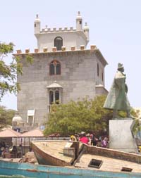 Die "kleine" Torre de Belem am Hafen von Mindelo auf São Vicente, Kap Verde. Rechts im Bild die Statue von Heinrich dem Seefahrer (1394-1460).