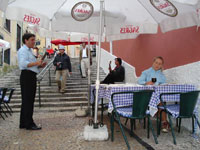 Mein erster Pilgertag! Es ist schon Abend und ich bin immer noch in Lissabon. Dabei wollte ich doch heute noch aus Lissabon raus sein. "Gewandert" bin ich aber trotzdem viel. Lissabon ist groß, wenn man zu Fuß ist! Den ganzen Nachmittag bin ich auf der Suche nach einem Pilgerpass gewesen. Gar nicht so einfach wie zuerst gedacht! Von Kirche zu Kirche rennen, 1 1/2 Std. auf den Prior warten und ihn schließlich überzeugen, dass ich ein ehrlicher Pilger sei und er mir ruhig einen Pilgerpass geben könne, obwohl ich kein Gutschreiben dabei hatte. Auf der Suche nach dem Pilgerpass, war ich auch im Centro Nacional de Cultura. Doch helfen konnten sie mir nicht. Ich kaufte aber dort den Guia do Caminho de Fátima. Beruhigt und zufrieden, fand ich anschließend eine nette kleine Pension (15 Euro). An der Rezeption ein Ex-Polizist (Polícia Judiciária). Nach 7 Jahren Dienst und nachdem er seinem Vorgesetzter fast alle Zähne aus dem Mund geschlagen hatte, "ging" er (wurde wohl gegangen). Nun sitze ich in einem netten kleinen Restaurant und genieße eine Caldeirada de peixe (Fischeintopf). Morgen werde ich um 05:30 Uhr geweckt.