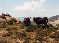 Nach einer guten halben Stunde mühsamen Aufstiegs in einer Geländefalte mit wild wuchernder Vegetation das sanfte Läuten einer Kuhglocke, nach all den Strapazen sehnlicher erwartet und freudiger begrüßt als das Läuten, mit dem wir Kinder vom Christkind (oder waren es unsere Eltern?) zu dem leuchtenden Weihnachtsbaum und unseren Geschenken gerufen wurden. Als wir näher kamen, beäugten drei Damen aus Sirvozelo uns voll unschuldiger Neugierde. Von all den anderen: keine Spur (nem rasto). Es half also alles nichts: weiter ging's bergauf in der sengenden Hitze.