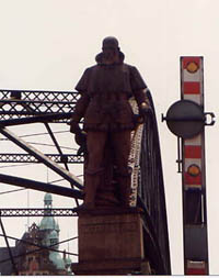 Der alte Platz auf der Kornhausbrücke ist in jeder Weise ungünstig. Erst einmal sind die Statuen den massiven Auspuffgasen der drei- bis vierspurig ausgebauten Straße Zippelhaus/Doovenfleet ausgesetzt. Dann blicken sie gen Norden, d.h. sie sind für Betrachter und Fotografen schwer ins Visier zu bekommen, zumal sie auch noch sehr hoch stehen (die Brückenpfeiler, auf denen sie stehen, sind allein schon fast 4 Meter hoch). Schließlich nehmen die gusseisernen Brückenträger und Widerlager, an denen die Statuen förmlich "kleben", viel von ihrem ästhetischen Reiz.
