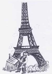 "Der Zé Povinho, den bacalhau fest im Griff, vor seiner Hütte zu Füßen des Eiffelturms" Zeichnung von Elisabeth Axmann - nach dem Film "Fado Lusitano" von Abi Feijó