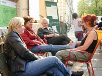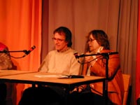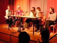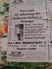 Die "Nelkenrevolution" - 30 Jahre danachEs war ein großes Fest am 1. Mai in der Werkstatt 3 in Ottensen, und viele Portugalfreunde und PHG-Mitglieder waren erschienen. Es begann schon am Nachmittag mit der Vorführung des Filmes "Torre Bela". Im Publikum der Sänger Francisco ("Chico") Fanhais, der nicht schlecht staunte, als er sich im Film zusammen mit seinem Freund José ("Zeca") Afonso auf dieser emblematischen Kooperative auftreten und singen sah. Danach war der Merian-Redakteur Thorsten Kolle an der Reihe, der das neue Lissabonheft vorstellte. Er las Texte daraus vor über die Ereignisse des 25. April verfasst von Walter Haubrich und Julia Knobloch. Ihm folgte die Journalistin Swantje Strieder, die Auszüge aus ihrem Artikel über die afrikanischen Immigranten in der Cova da Moura vortrug. Und Peter Koj berichtete, wie er all das Material für den Info-Teil zusammengetragen hat, der die letzten 24 Seiten des Heftes einnimmt. Anschließend versammelte sich auf der Bühne eine Runde, um über die Ereignisse während und nach der Revolution zu diskutieren: António Borralho von der Werkstatt 3, Chico Fanhais selbst, Luís Carvalho und Peter Koj. Vor dem Konzert von Chico Fanhais war noch Zeit, Energie im Restaurant zu tanken, wo eine echte feijoada serviert wurde. Das Konzert, das gegen 21 Uhr begann, war der unbestrittene Höhepunkt des Festes. Trotz einigen Verschleißes (Chico war seit einer Woche auf Konzerttournee durch Portugal und Norddeutschland) gelang es ihm, mit seiner schönen Stimme und den die Lieder begleitenden Erläuterungen das Publikum in seinen Bann zu ziehen. Das Fest war von der Werkstatt 3 in Zusammenarbeit mit unserer Gesellschaft organisiert. Ein weiterer Beitrag von unserer Seite waren die Polit-Graffiti aus Lissabon, die wir schon vor 5 Jahren im Kulturhaus Eppendorf ausgestellt haben. Wer sie noch nicht kennt, kann sie im Restaurant betrachten, wo sie noch einige Zeit abgehängt bleiben. |