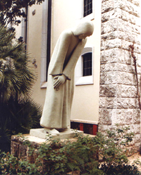 "Die Trauernde" (A Dor), Betonplastik von Hein Semke im Ehrenhof der evangelischen Kirche im Lissabonner Stadtteil Palhavã