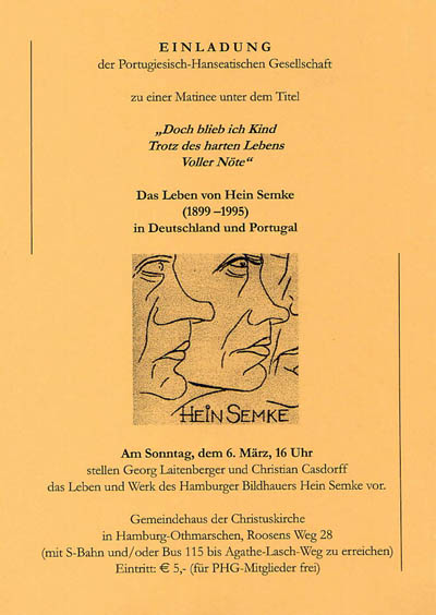 Dieser Ausgabe der Portugal-Post haben wir eine Einladung zu einer Matinee über Hein Semke beigelegt. Der Hamburger Künstler, der einen Großteil seines Lebens in Portugal verbrachte, war zentrales Thema der letzten Ausgabe. Die Matinee wird von Georg Laitenberger und Christian Casdorff gestaltet und findet am Sonntag, dem 6. März, um 16 Uhr im kleinen Gemeindesaal der Christuskirche in Othmarschen statt. Die Kirche liegt 10 Minuten zu Fuß vom S-Bahnhof Othmarschen. Der Bus 115 hält direkt davor (Agathe-Lasch-Weg) und für Autofahrer gibt es reichlich Parkplatz. Der Eintritt kostet 5 Euro; für PHG-Mitglieder ist der Eintritt frei.