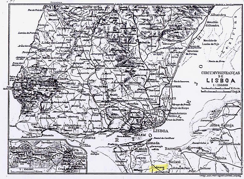 Amora ist heute ein eher unbedeutender kleiner Fischerort, etwa 15 km gegenüber Lissabon am unteren Teil des mar da palha gelegen. Er wurde der größeren Industriestadt Seixal eingemeindet. Hier eine zeitgenössische Karte zur Orientierung: