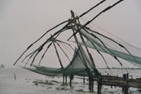 Als ich am nächsten Morgen früh aus dem Fenster des Hotels auf dem Willingdon Island schaue, liegt Mattancherry Island mit der Altstadt Cochins gegenüber in leichtem Dunst am Wasser. Das Boot mit dem Fischer, der sein rundes Netz auswirft, die alten chinesischen Netze an der Flussmündung, alles wirkt, als sei die Zeit vor hunderten von Jahren stehen geblieben und als läge noch der Duft nach Nelken, Zimt, Kardamom und anderen Spezereien in der Luft.