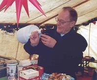 Pastor Laitenberger com garrafão no bazar de Natal em Aumühle
