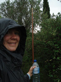 Methodenverbesserung: laufe jetzt mit Papier und Kugelschreiber in der Hosentasche. Es fängt an zu regnen. Meinen Regenponcho habe ich schnell aus der Tasche gezogen, weil er absichtlich zuoberst lag. Mit dem Gepäck unten drunter, sehe ich jetzt aus wie ein Schneckenhäuschen. Zwar schützt der Poncho vor Regen, macht mir aber das Gehen schwerer, weil er überall hängen bleibt. Es kommt noch schlimmer, denn plötzlich tut sich vor mir eine Mauer von wildem Dornengestrüpp auf. Der Weg ist kaum zu erkennen. Ich ziehe den Poncho aus und kämpfe mich durch. Ich komme mir dabei vor wie der Prinz im Dornröschen-Märchen, der sich durch eine fast unüberwindbare Mauer von wilden Rosen durchkämpft, um an das verborgene Schloss zu gelangen. Der Pilgerstock ist mein Schwert. Mal ganz ehrlich! Entweder gehen die Pilger einen anderen Weg oder es gehen einfach nicht viele. Wie ist dieser fast undurchlässige Weg sonst zu erklären?