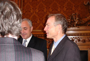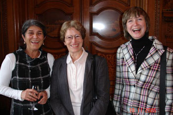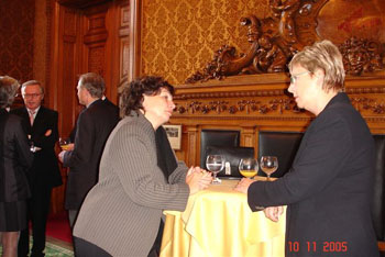 In ihrer Erwiderung zeigte auch die Senatorin Zufriedenheit darüber, dass Hamburg mit der Rudolf Roß Gesamtschule eine Verbindung zwischen dem bereits existierenden Unterricht an der Universität, an der gymnasialen Oberstufe und dem Portugiesischunterricht an der Primarstufe und der Sekundarstufe verfügt. Nach der Unterzeichnung des Protokolls mischten sich die Vertreter des portugiesischen Staats und der Stadt Hamburg unter die Anwesenden zu einem formlosen Gespräch. Da waren, abgesehen von den Lehrern der Rudolf Roß Gesamtschule wie Romi Gomes und unser Mitglied Silvia Baedeker, als Leiter der Sprachenabteilung der Hamburger Schulbehörde Dr. Detlev Kahl, von der Universität Hamburg unser Mitglied Dr. Fátima Figueiredo Brauer und Madalena Simões vom Centro de Língua Portuguesa (Instituto Camões). Auch der Honorarkonsul für Brasilien, Lucas C. Meyer, fehlte nicht, gibt es doch eine starke brasilianische Präsenz an der Schule. Außerdem hatten verschiedene portugiesische Kulturvereine ihre Vertreter geschickt, wie unseren Freund Manuel Loureiro von den Retalhos de Portugal und unser Mitglied und Mitstreiter Luís Carvalho vom F.C. Portugal 82. Unsere Gesellschaft wurde durch ihre Vorsitzenden Maralde Meyer-Minnemann und Dr. Peter Koj vertreten.
