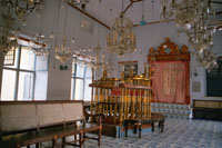 Deutsche Reisegruppen schlendern nicht. Wandergewohnt schreiten sie schnell aus. Auch bei tropischer Hitze: Auf dem eiligen Weg zur Synagoge schaue ich mir die kleinen, gedrängten kolonialen Gebäude an. Nur die Fassaden. Den Blick ins Innere der Antiquitätenläden, die sie beherbergen, versage ich mir. Es geht an der alten Gewürzbörse vorbei. Keine Zeit, eine Nase Zimt zu erschnuppern. Am Ende der Straße liegt dann die älteste Synagoge Indiens, die der Paradesim oder Weißen Juden, die zumeist sefardischer Herkunft waren und ursprünglich Ladino sprachen. Ich denke an meinen Freund Michael Studemund-Halévy, den Sefardenspezialisten, der mich sicher um diesen Augenblick beneidet... Ich kann nicht einmal eine Geschichte der Synagoge für ihn erstehen. Sie ist ausverkauft. Der schlichte Synagogenraum, dessen Fenster weit offen stehen, ist hell und heiter. Unzählige Lampen hängen von der Decke. Der Boden ist mit blau-weißen chinesischen Fliesen belegt. Gegenüber der Synagoge hat Sarah Cohen ihr Geschäft, in dem sie zauberhafte Smokkleidchen und Stickereien verkauft. Sie erzählt, dass die meisten Juden in den Norden gegangen oder ganz ausgewandert seien, weil sie fast alle beruflich hochqualifiziert seien und in Cochin keine Arbeit fänden. Häufig fehlten Männer um die für den Gottesdienst notwendige Anzahl zusammenzubekommen, aber an Festtagen kämen sie alle "runter". Aus Bombay. Aus Israel. Aus England.