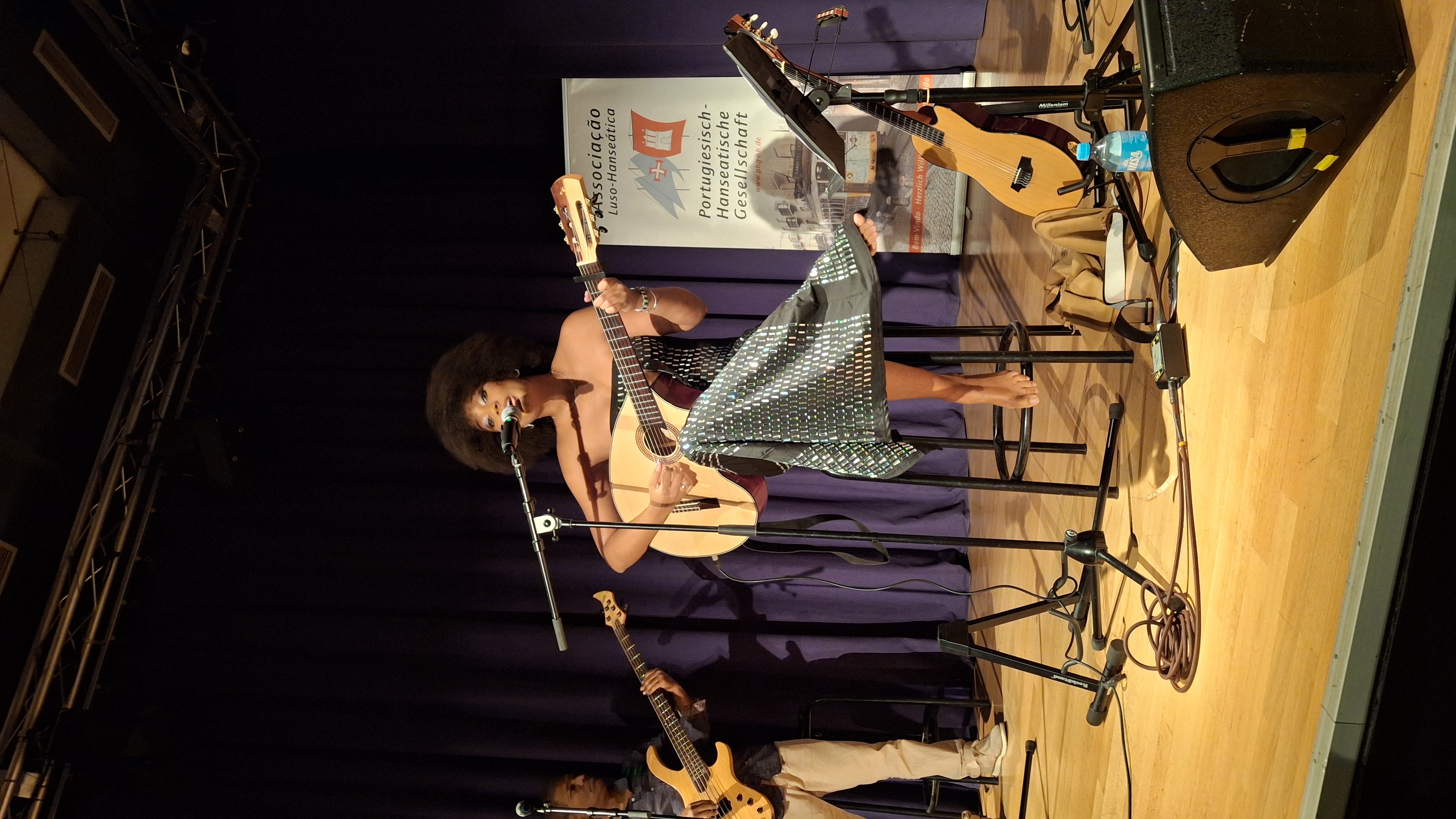 Mehr als 80 Gäste sahen den Auftritt der 30-jährigen Sängerin und Gitarristin Cláudia Sofia von der kapverdischen Insel São Vicente, die zusammen mit dem Bassisten Lúcio Vieira und dem Perkussionisten Markus Leukel einen Einblick in die Vielfalt kapverdischer Musik gab.